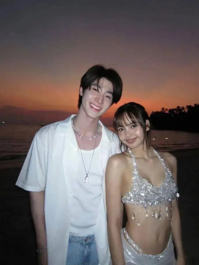照片中,Lisa身着亮片比基尼,与Blue Pongtiwat在夕阳海滩边并肩而立,两人笑容灿烂,氛围轻松亲密。